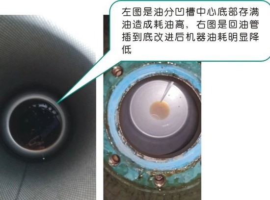 问题分析:回油管底部到油分凹槽中心底部间距接近两厘米,导致回油不彻底,已经分离下来的机油又随着压缩空气一起被带走造成机器跑油。机器回油效果的判断是油分凹槽中心底部存油情况,越少越好,而不单纯是用气吹时回油单向阀是通的。