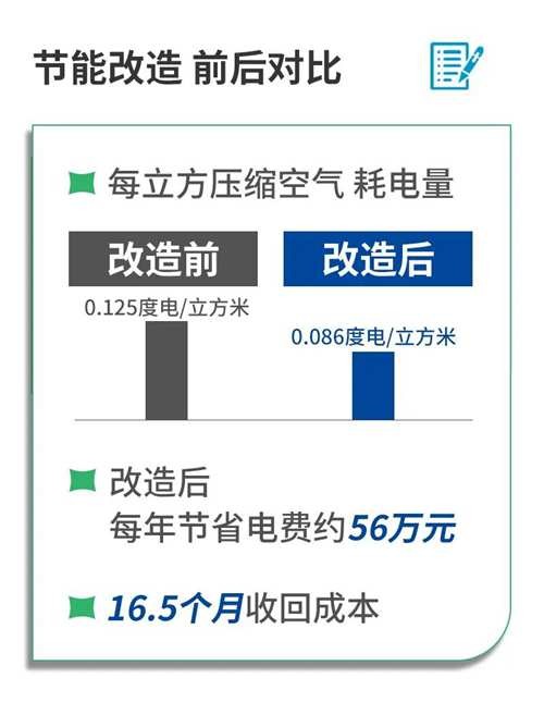 在改造成果方面,改造后客户每立方压缩空气的耗电量减少了0.039度电。如果按每年开机时间为300天计算,改造后每年将为客户节省电费56万元。计算投资回报率,客户16.5个月即可收回购机成本,节能改造的效果显著。