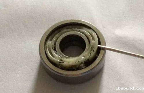 二、去除防尘盖后,我们翻转轴承,从空压机轴承的后面用针或者较细的硬物翘出保持架(可以先从前面用硬针顶一下)。