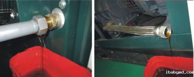 尽可能在热机状态下,打开冷却器排污阀和连接管道。准备好接废油的容器,尽量避免油品泄露造成环境污染。