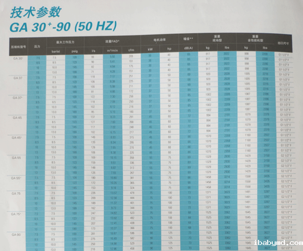 每个品牌的机型功率不一样,产气量也不同,以下是阿特拉斯科普柯空压机GA30+到GA90+的技术参数参考表。