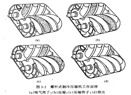 在螺杆式制冷压缩机中,随着转子连续旋转,吸气、压缩和排气过程会依次循环进行,各基元容积会依次工作,从而构成了该压缩机的工作循环。