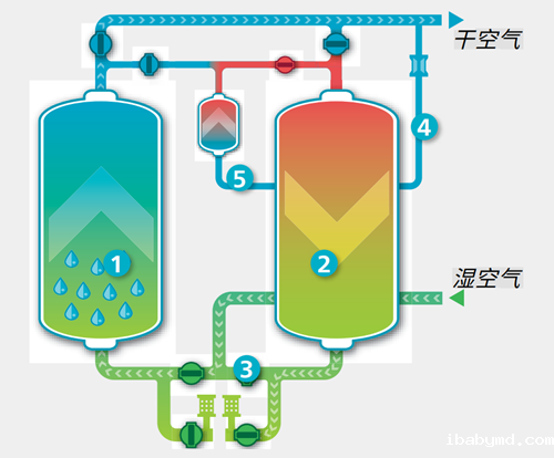 完成干燥剂再生后,两个干燥塔进行功能转换(3)。