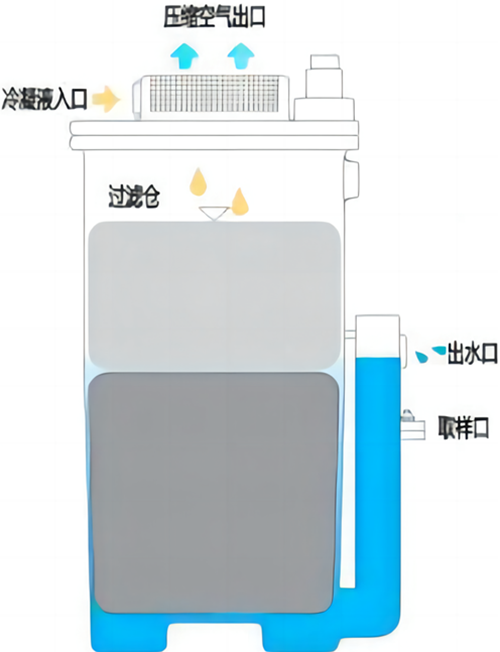 3、过滤仓中的吸油滤芯吸附、过滤冷凝液中的大部分油滴。