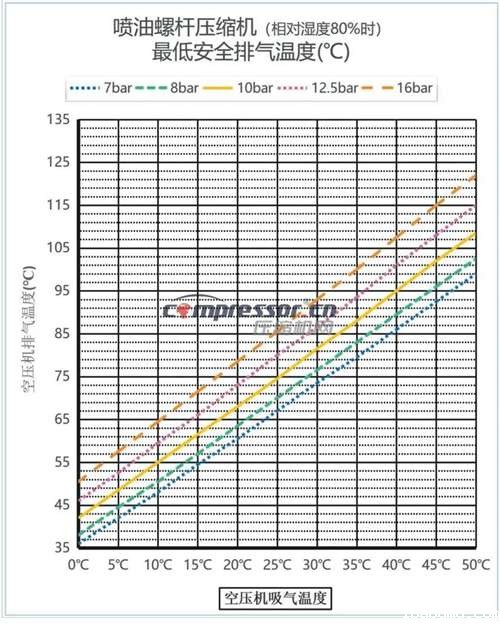 在常压(0.7~0.8MPa)空压机中,排气温度通常在70~90℃之间。尽管理论上等温压缩过程可能比绝热压缩效率更高,但实际中压缩机的最高效率仍略低于绝热压缩。因此,压缩机效率通常与绝热压缩而非等温压缩相比较。如果喷入足够的润滑油并保持低温,排气温度甚至可能低于进气温度。同时,排气温度也有下限要求,以防止压缩后的水蒸气冷凝。在100%相对湿度下,从20℃环境温度压缩到0.8MPa时,饱和温度约为59℃。为防止冷凝水产生,排气温度通常不低于70℃。一旦在系统中出现冷凝水,应将压缩机停车5-6小时,让油与水充分分离并排放水分,否则会使油质恶化并降低润滑油、过滤器、轴承等配件寿命。