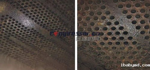 1、山东某化工行业三台315kW水冷型螺杆空压机,采用开式冷却塔降温冷却,和其他生产设备共用一套冷却塔,源水采用地下水作为补充水。化验循环水质,硬度1250mg/l,电导率3680us/cm,PH值8.5,泥沙含量大,结垢频繁,换热器堵塞严重,平均每三个月需拆开换热器清洗一次,夏季更是频繁高温报警,用户苦不堪言。