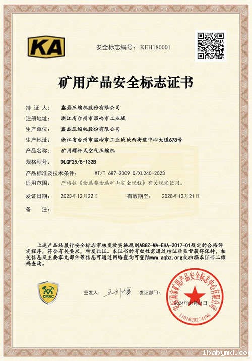 KA认证代表着鑫磊矿用螺杆式空气压缩机已经通过了严格的质量、性能和安全性评估,符合《金属非金属矿山安全规程》的相关要求。对于矿山企业而言,这不仅是选择设备的重要参考,更是确保安全生产的坚实保障。