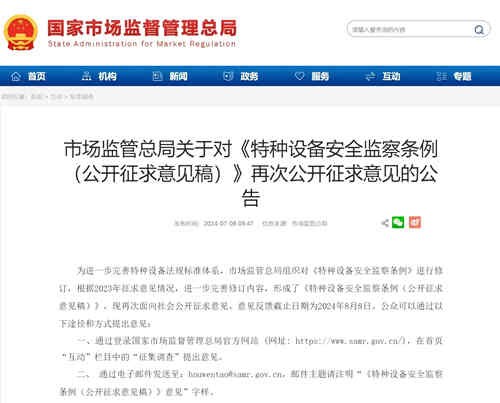国家市场监督管理总局7月8日发布了《特种设备安全监察条例》的公开征求意见稿的再次公开征求意见的公告