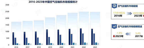 目前压缩机中空气压缩机为市场主流产品,被广泛应用于机械、冶金、电子电力、医药、包装、化工、食品、采矿、纺织、交通等众多工业领域。随着全球经济的发展和下游应用领域的增加,工业空气压缩机市场发展潜力巨大,行业需求将持续增长,据统计2023年全球工业领域空气压缩机市场规模达363亿美元,2018-2023年CAGR约为5.7%。