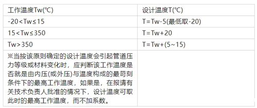d.采用蒸汽吹扫的管道当介质温度高于吹扫蒸汽的温度时,则按介质温度根据上表确定其设计温度。当介质温度低于吹扫蒸汽温度时,应视具体情况而定。例如,按介质温度选取的管道及其元件不能承受吹扫介质的条件时,应适当提高等级以适应吹扫介质条件。