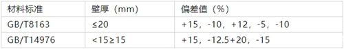 各种钢管标准中规定的负偏差值是不完全相同的,GB/T8163流体输送用无缝钢管、GB/T14976流体输送用不锈钢无缝钢管规定的壁厚偏差值如下:常用标准的壁厚偏差值