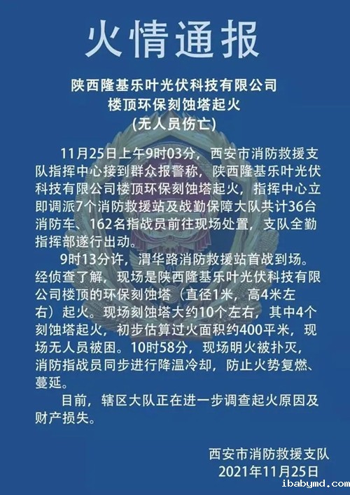 2021年11月,陕西隆基乐叶光伏科技有限公司101厂房浓烟滚滚。据悉,这次失火烧毁厂房和生产设施,过火面积超过10000平方米,属于重大火灾事故。