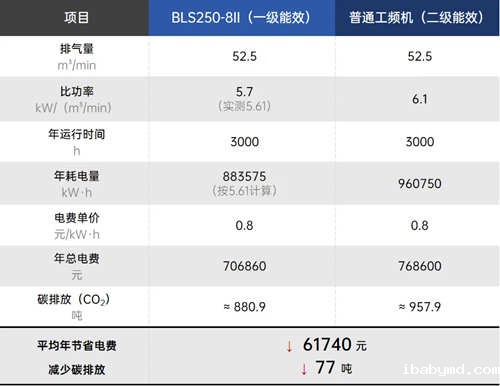 该产品采用 工频驱动结构+高效水冷系统+双级压缩技术 组合方案,在煤矿行业的生产场景中表现出良好节能特性,实测工况下比功率为5.61kW/(m³/min),超出国家一级能效指标1.58%。