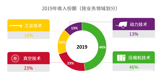 阿特拉斯·科普柯集团是拥有四大业务领域的分权制集团,包括压缩机技术、真空技术、工业技术、动力技术。2019年,压缩机技术占全部收入的46%,真空技术占23%。工业技术占18%,动力技术占13%。