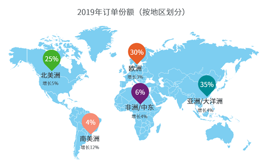 阿特拉斯·科普柯集团的业务遍及世界各大洲,客户遍布在超过182个国家/地区的各行各业中。2019年,亚洲/大洋洲占全部订单的35%(增长4%),欧洲占30%(增长3%),北美洲占25%(增长5%),非洲/中东占6%(增长4%),南美洲占4%(增长12%)。