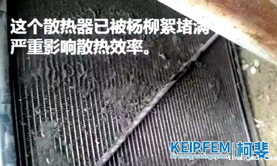 春天中杨柳絮满天飞舞,无孔不入,一旦附着在冷却器上就会粘连,如果有油污的话,粘连情况会更加严重,严重影响冷却器的冷却效果。导致压缩机机头温度升高,报警停机,严重者可能导致螺杆抱死。