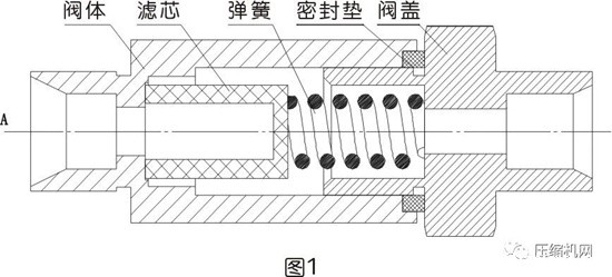 该机器是高压氧气压缩机,为了确保机器正常运转,每级都设有过滤器,过滤器型号是SS-6GL-10M,过滤器结构如图1所示,过滤器体为不锈钢,滤芯是烧结不锈钢,过滤精度是90μm,在全无油润滑15MPa高压充瓶氧气压缩机使用中也有使用,曾出现过因过滤器堵塞而致压缩机不能正常工作的情况。气阀正常,推测是过滤器堵塞所致。于是拆检过滤器。