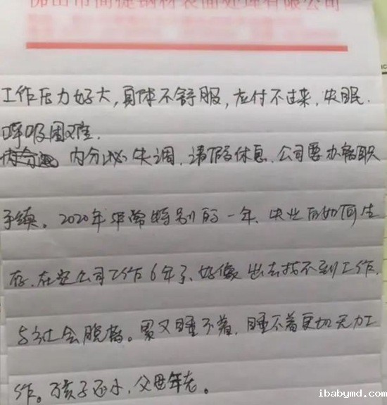 死者留下了一张纸条,写到:自己工作压力好大,身体不舒服想请假休息,公司要办离职手续。在这里工作6年了,与社会脱轨,今年又是特殊的一年,如果失业更找不到工作。每天失眠睡不好,更加无力工作。孩子还小,父母年老。