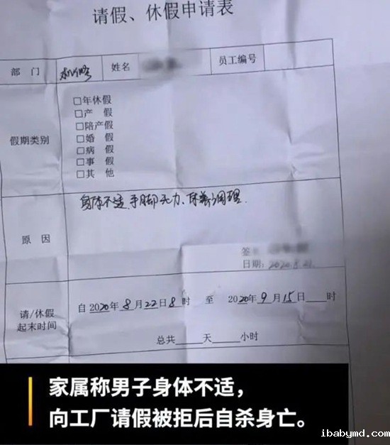 员工请假被拒在工厂自杀身亡,留纸条:工作压力好大
