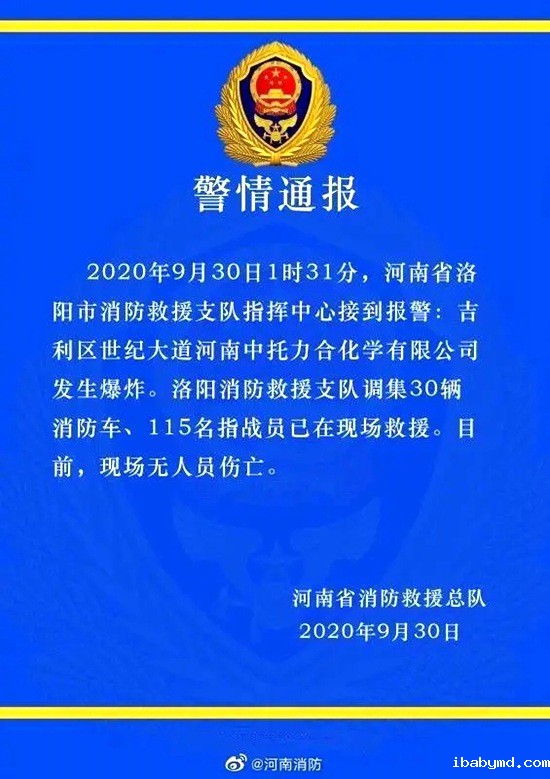 9月30日1时31分,河南省洛阳市消防救援支队指挥中心接到报警:吉利区世纪大道河南中托力合化学有限公司发生爆炸。洛阳消防救援支队调集30辆消防车、115名指战员已在现场救援。目前,现场无人员伤亡。