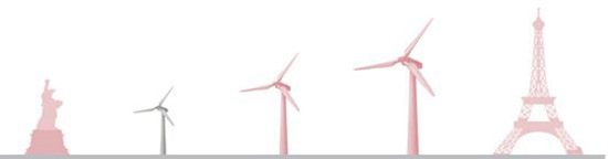 不同高度的风力发电机(注:最左侧自由女神像高为93米,最右侧埃菲尔铁塔高为324米)