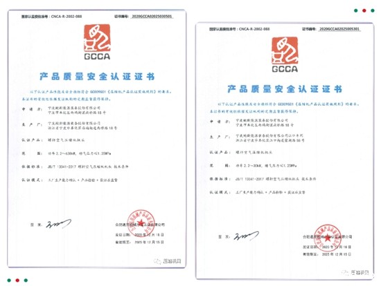 作为专业的认证机构,GCCA有严格、完备的认证程序,获证过程要经过两大环节:一是产品检测,一是工厂能力确认(即工厂生产条件检查)。目前,主机GCCA质量安全认证采用“工厂生产能力确认+产品检验+获证后监督” 的认证模式。容积流量、比功率、轴功率,全部项目均符合产品标准规定的要求时,才能判定该样机检测合格。