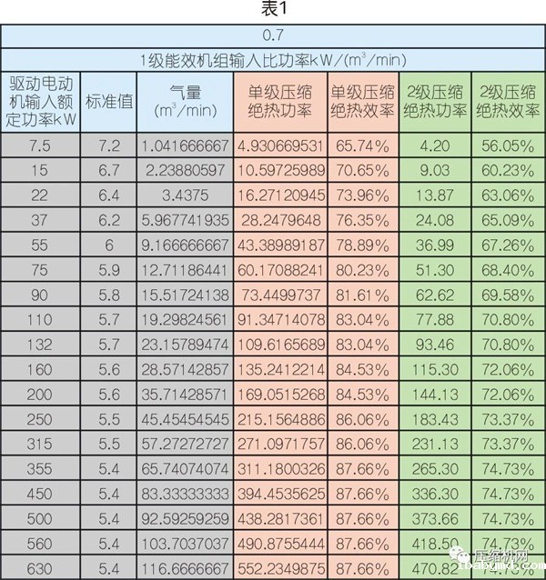 本文主要从喷油螺杆空压机对1级能效限定值的绝热效率需求值去分析主机对空压机节能的影响,并运用绝热效率来揭示单级压缩和两级压缩节能的秘密。