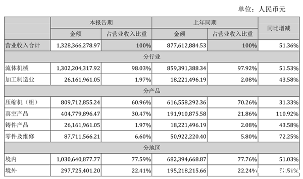 2021年,随着疫情的在大陆的稳定,整个制造业越发景气。同时随着工业水平的不断提升,以及我国节能环保相关政策日益严格,对空气压缩机设备的需求也在不断提升。整个空压行业在2021年上半年业绩非常景气。汉钟精机在整个行业成长的大环境下,空压产品上半年也是收获了一定幅度的成长。