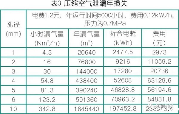 例:当孔径为3mm,管内空气的绝对压力为0.5MPa时,每小时的泄漏空气量为: