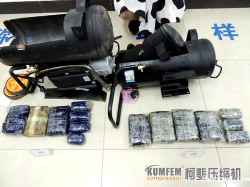 在进一步检查过程中,执勤民警发现,在距离女子不远处还有2台空气压缩机,且空气压缩机的螺丝均有被拧过的痕迹。执勤民警当场从2台空气压缩机夹层中查获冰毒14包,重5.18公斤。